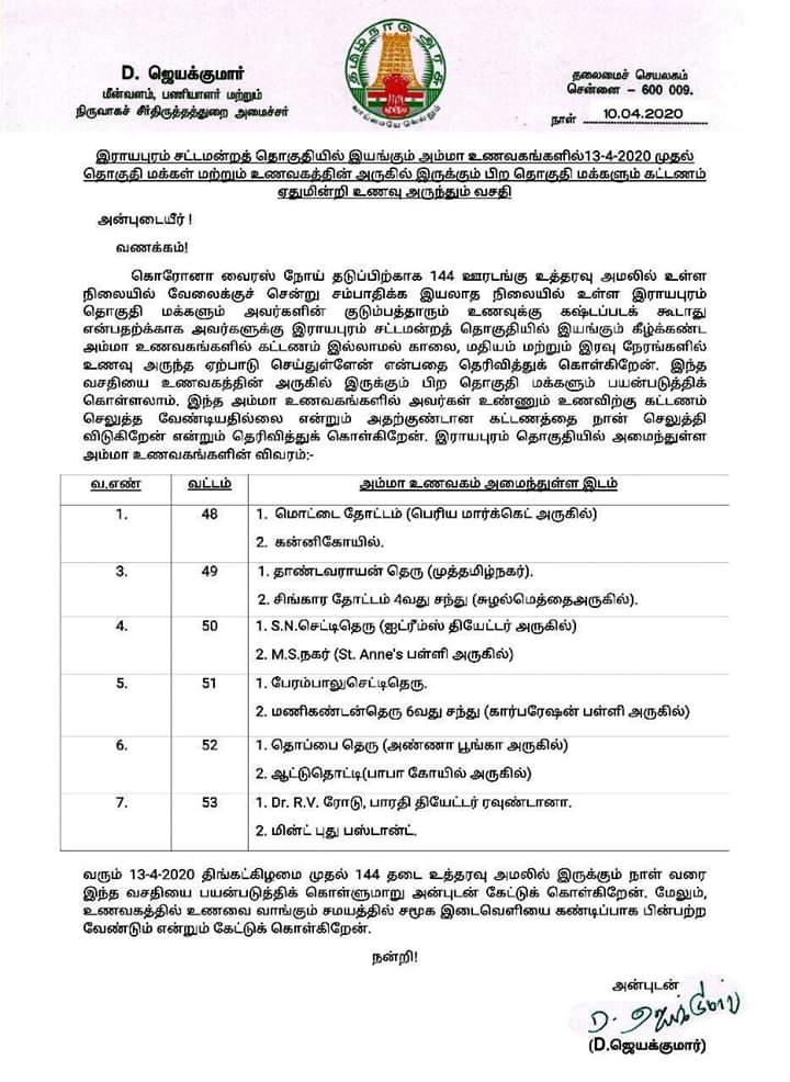அம்மா உணவகத்தில் விலையில்லா உணவு . அமைச்சர் ஜெயகுமார் சொந்தச் செலவில் ஏற்பாடு.நாளை முதல் ஊரடங்கு அமலில் இருக்கும் வரைண அம்மா உணவகத்தில் உணவு இலவசமாக வழங்கப்படும் என ராயபுரத்தில் அமைச்சர் ஜெயக்குமார் பேட்டியளித்தார். ராயபுரத்தில் உள்ள 7 உணவகங்களில் உணவு இலவசமாக வழங்கப்படும் என கூறினார். உணவை வாங்கும் போது அனைவரும் கண்டிப்பாக சமூக இடைவெளி பின்பற்ற வேண்டும் என கூறினார். மேலும் சென்னையில் நாளை முதல் பேக்கரிகள் இயங்கும்.