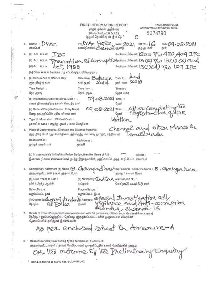 பேரில் எஸ்பி வேலுமணியுடன், பி.அன்பரசன், கேசிபி இன்ஜினியர்ஸ் பிரைவேட் லிமிடெட், , கேசிபி இன்ஜினியர்ஸ் பிரைவேட் லிமிடெட் நிர்வாக இயக்குனர் சந்திர பிரகாஷ், , கேசிபி இன்ஜினியர்ஸ் பிரைவேட் லிமிடெட் நிறுவனத்தின் இயக்குனர் மற்றும் பங்குதாரர் சந்திரசேகர், எஸ்பி பில்டர்ஸ் நிறுவனர் முருகேசன், ஜேசு ராபர்ட் ராஜா, தி ஏக டெக் மெசினரி காம்பணன்ட்ஸ் இந்தியா பிரைவேட் லிமிட், கான்ஸ்ட்ரானிக்ஸ் இன்ப்ரா லிமிடெட், கான்ஸ்ட்ரோமலி குட் பிரைவேட் லிமிடெட், ஸ்ரீ மகா கணபதி ஜூவல்லர்ஸ், ஆலயம் பவுண்டேசன்ஸ் பிரைவேட் லிமிடெட், வைதுர்யா ஹோட்டல்ஸ், ரத்னா லக்ஷமி ஹோட்டல்ஸ் பி லிமிடெட், ஆலம் கோல்டு மற்றும் டைமண்ட்ஸ், ஏசூர் இஎஸ பிஇ இன்ப்ரா , கு ராஜன் உள்பட 17 பேர் மீது ஊழல் தடுப்பு மற்றும் இலஞ்ச ஒழிப்புத் துறை முதல் தகவல் அறிக்கை பதிவு செய்துள்ளனர்.