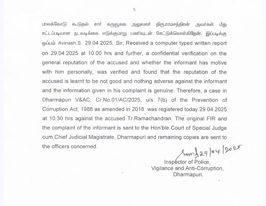 கூடுதல் சார்நிலை கருவூல அலுவலர் இராமச்சந்திரனிடம் அந்த ரூபாய். பத்தாயிரத்தை கொடுத்திருக்கிறார்.அப்போது அப்பகுதியில் மறைந்திருந்து கண்காணிப்புப் பணியில் ஈடுபட்ட தர்மபுரி மாவட்ட ஊழல் தடுப்புக் கண்காணிப்பு மற்றும் லஞ்ச ஒழிப்புத் துறை துணைக் கண்காணிப்பாளர் நாகராஜ், ஆய்வாளர் பெருமாள் ஆகியோர் லஞ்சம் பெற்ற இராமச்சந்திரனை பணம் பெற்ற கையுடன், பிடித்தனர். அதைத் தொடர்ந்து அவரை கைது செய்து விசாரணை நடத்தினார்கள். லஞ்சம் பெற்ற வழக்கில் பாலக்கோடு கூடுதல் சார்நிலை கருவூல அலுவலர் கைது செய்யப்பட்டு நீதிமன்றத்தில் ஆஜர் படுத்தப்பட்டு சிறையில் சேர்த்தனர்.